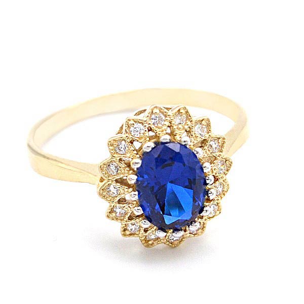 Dámský zlatý prsten s modrým kamenem a zirkony zdobený ovál ze žlutého zlata.