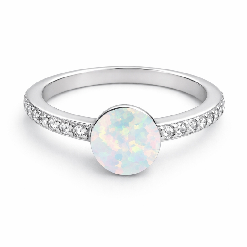Elegantní dámský prsten z bílého zlata, který zaujme na první pohled jemným, ale výrazným opálem s duhovými odlesky. Středový kámen je doplněn řadou drobných zirkonů po obvodu obroučky, které dodávají prstenu jemný třpyt a luxusní vzhled.