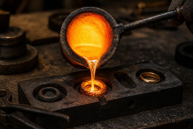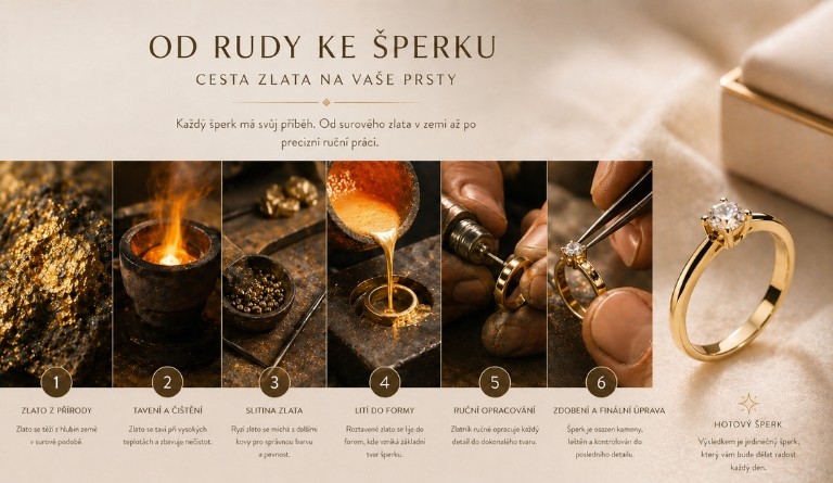 👉 Ve zkratce: zlato se vytěží, vyčistí na ryzí zlato, smíchá se s dalšími kovy (vznikne slitina), následně se odlévá do tvaru a ručně opracovává.
