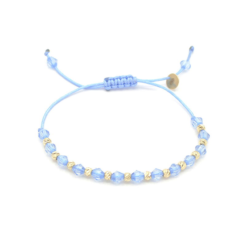 Originální šňůrkový náramek světle modré barvy zdobený válečky modré barvy a zlatými kuličkami s gravírováním střídajících se pravidelně. Na provázku je rovněž zavěšené zlaté kolečko s vyrytou značkou a puncem.