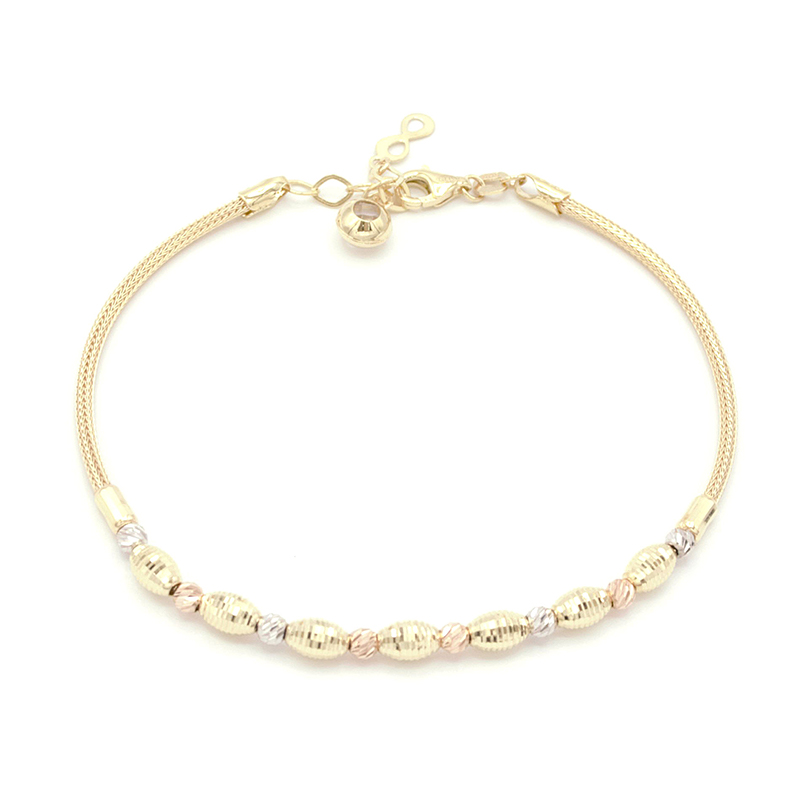 Pro milovníky barev je tu stylový náramek tři barvy zlata. Zdobený lesklými kuličkami a válečky s gravírovanými proužky, střídajícími se ve středové části náramku, a s přívěskem nekonečno u zapínání. Tento náramek je skvělou volbou pro ty, kteří chtějí svému outfitu dodat barevný a originální prvek.
