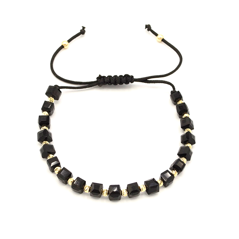Tento originální provázkový náramek je ideálním doplňkem pro ženy i muže. Vyrobený z černého provázku, je zdobený elegantními zkosenými kostičkami v černé barvě a lesklými kuličkami ze žlutého zlata s jemným gravírováním. Kombinace těchto prvků vytváří moderní a stylový vzhled, který se hodí k jakémukoli outfitu.