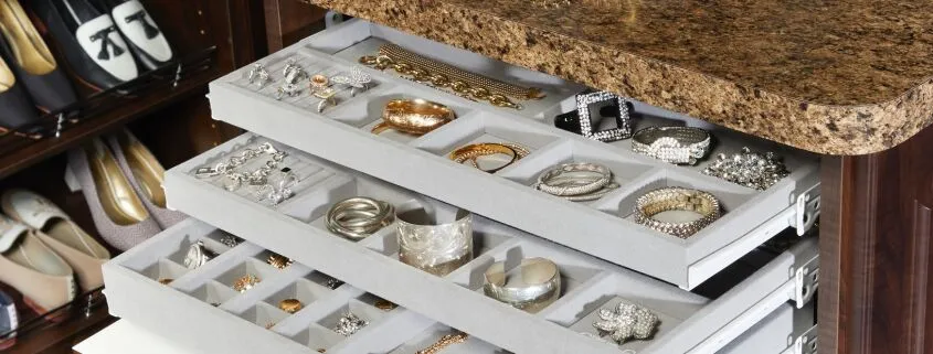 Pokud preferujete horizontální úložiště skryté pohledům, najděte šperkům zásuvku v stole nebo jiném nábytku. Je to skvělá alternativa, pokud máte rádi minimalistický styl nebo se obáváte, že by šperky mohly lákat malé děti nebo domácí mazlíčky.