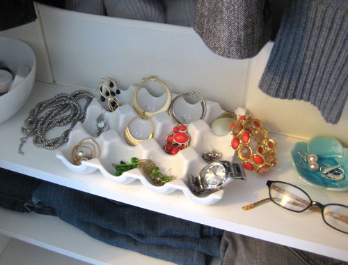 Začněte reorganizací toaletního stolku nebo komody a uvolněte první zásuvku. Pořiďte si přihrádkové kazety na šperky, které jsou k dostání v obchodech. Dbejte na dostatečný počet přihrádek, rozměry a vnitřní materiál. Robustnějším šperkům můžete vyhradit keramické nebo dřevěné misky a mělké mušle.