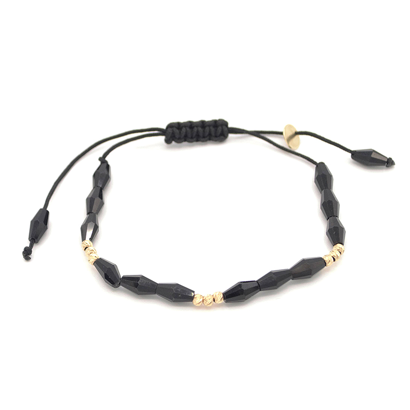 Originální provázkový náramek černé barvy zdobený zkosenými korálky černé barvy a zlatými kuličkami s gravírováním střídajících se pravidelně po celém obvodu náramku v lesklém vzhledu.