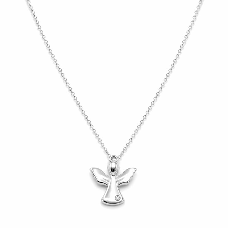 Elegantní náhrdelník z bílého zlata s jemným přívěskem andílka představuje nadčasový šperk s hlubším symbolickým významem. Lesklé hladké provedení dodává přívěsku luxusní vzhled, zatímco drobný zirkon zasazený ve spodní části decentně zachytává světlo a podtrhuje jeho něžný charakter.