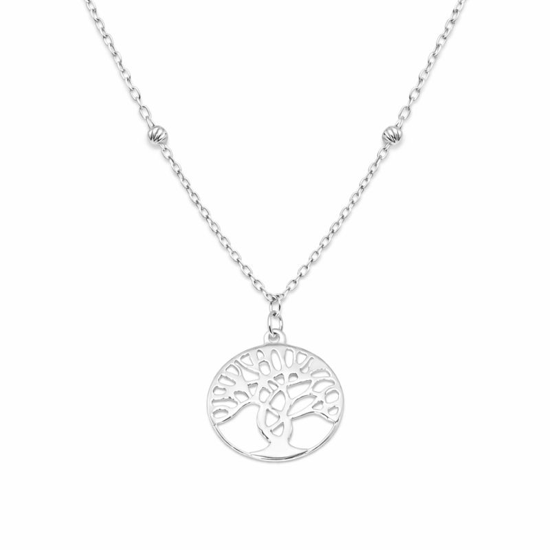 Dámský zlatý řetízek ozdobený zavěšeným přívěskem strom života a kuličkami z bílého zlata se zapínáním na pérový kroužek.