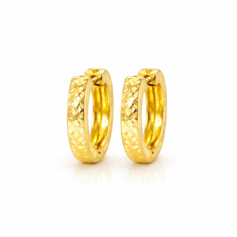 Originální náušnice kruhového tvaru s gravírovaným mřížkováním z jedné poloviny obvodu v lesklém vzhledu s kvalitním pevným zapínáním na zacvaknutí.