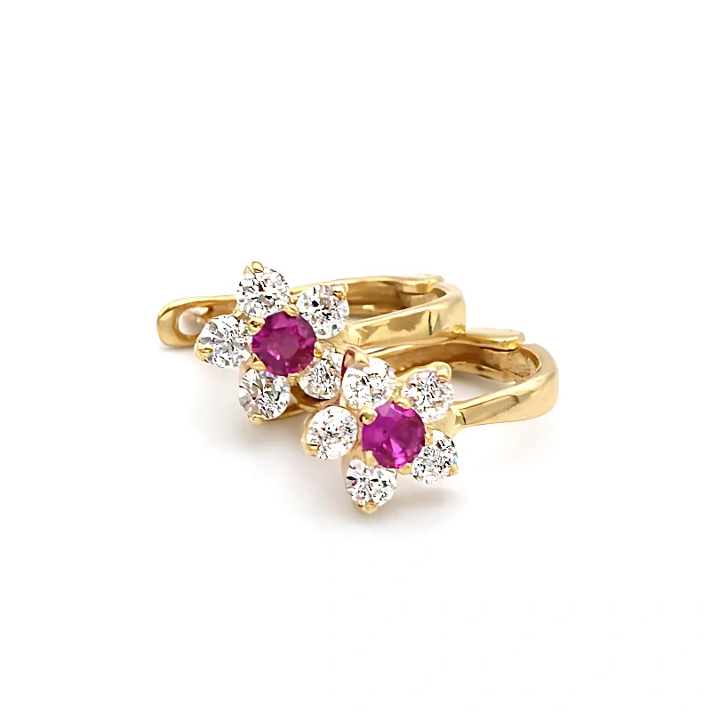 Jemné náušnice ve tvaru kytičky jsou vyrobeny ze žlutého zlata o ryzosti 585/1000 (14 karátů). Střed zdobí zářivý růžový kamínek, který je elegantně obklopen drobnými bílými kamínky. Díky své velikosti a pohodlnému zapínání jsou vhodné jak pro malé slečny, tak pro ženy s oblibou v decentních špercích.