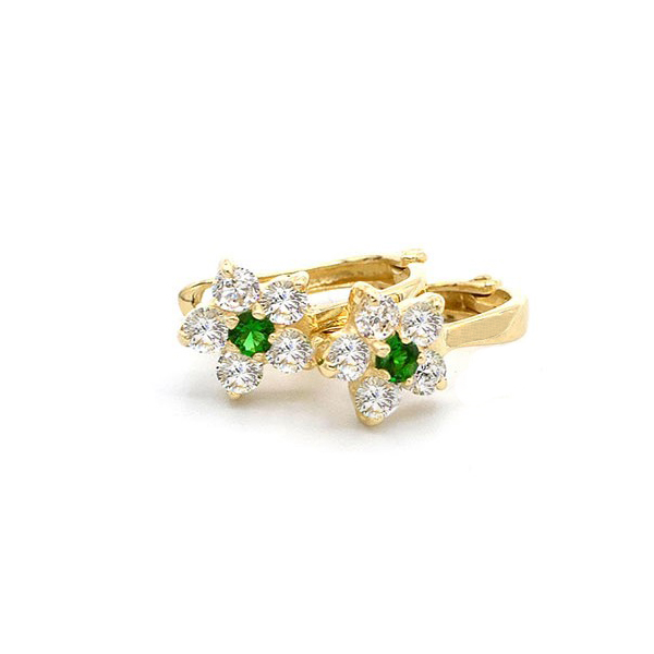 Romantické náušnice žluté zlato tvaru kytky zdobené zirkony a středovým zeleným kamínkem.