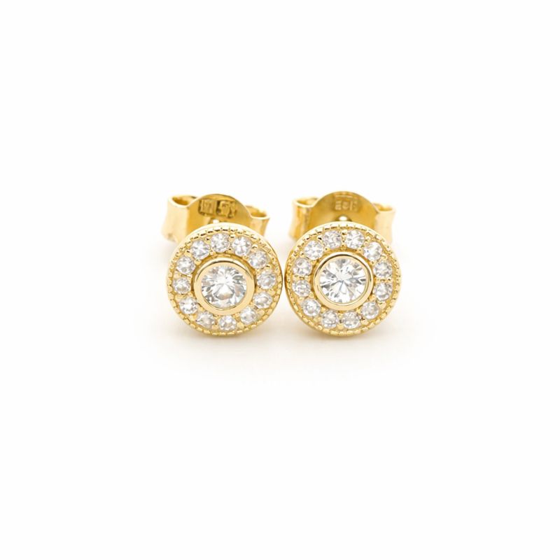 Dámské i dětské zlaté náušnice kulaté se zirkony ze žlutého zlata se zapínáním na puzetu.