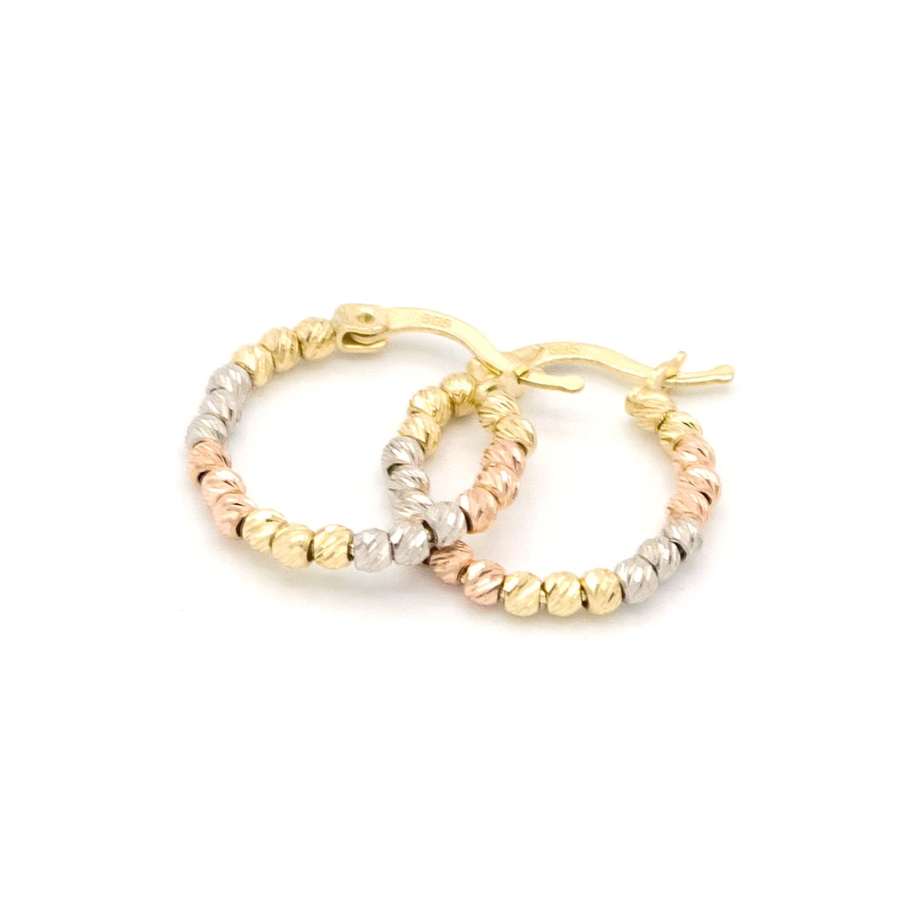 - Zlaté náušnice kruhy z lesklých kuliček tři barvy zlata