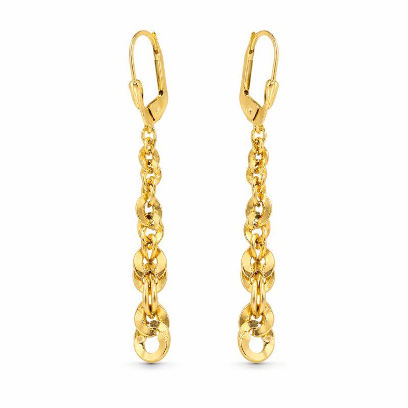 Elegantní visací náušnice ze žlutého zlata zaujmou svým moderním a zároveň nadčasovým designem. Dominantním prvkem je jemně navazující řetízek z lesklých kulatých oček, která se postupně zvětšují a vytvářejí zajímavý, pohyblivý efekt při nošení.
