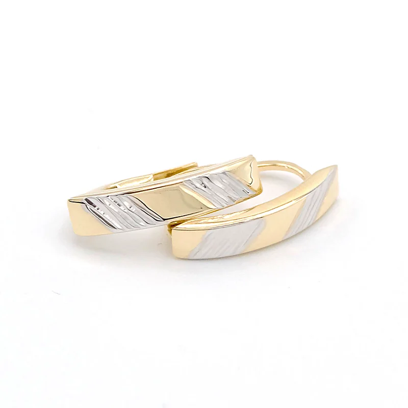 Dámské zlaté náušnice zaoblené s proužky ze žlutého a bílého zlata s klasickým zapínáním na klips.