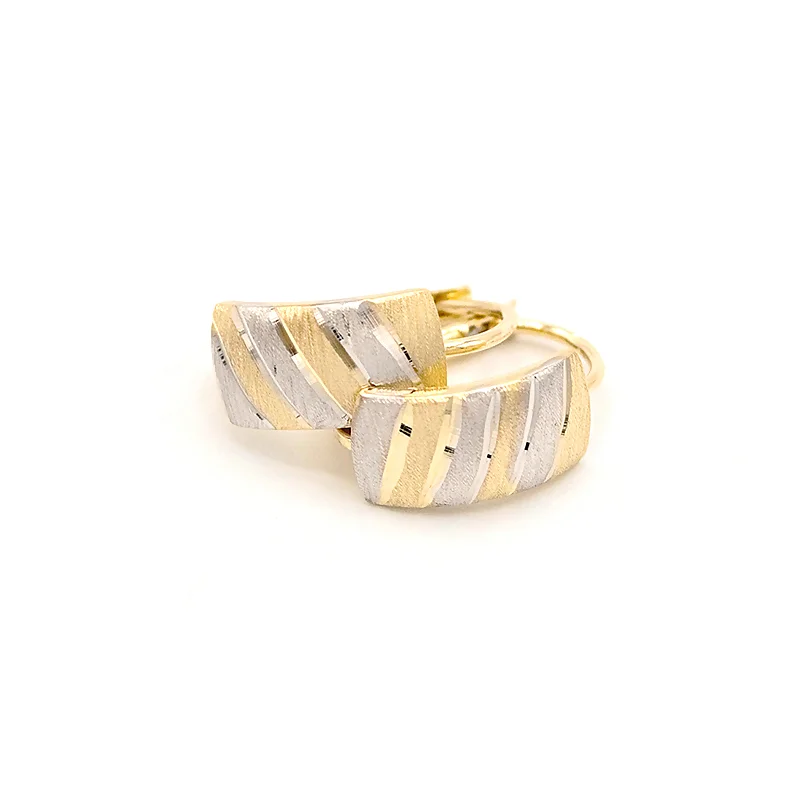 Elegantní náušnice dvě barvy zlata zaoblené zdobené pruhy v odlehčené verzi v lesklém vzhledu vhodné pro ženy i malé slečny.