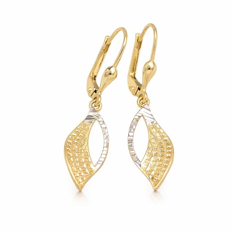 Elegantní visací náušnice z kombinace žlutého a bílého zlata, které zaujmou svým jemně zvlněným tvarem a propracovaným mřížkovaným zdobením. Dvoubarevné provedení dodává šperku zajímavý kontrast a zároveň umožňuje snadné kombinování s dalšími doplňky.