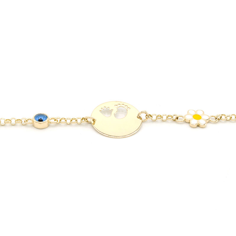 Dětský zlatý náramek Anker s přívěsky ze žlutého zlata pro děti s kvalitním zapínánm na karabinu. Originální náramek žluté zlato typ Anker tvaru hrášku zdobený středovou kulatou ozdobou s nožičkou a ručičkou a po stranách kytička s bílými lístečky a žlutým středem a modré kolečko se středovou teč... celý popis