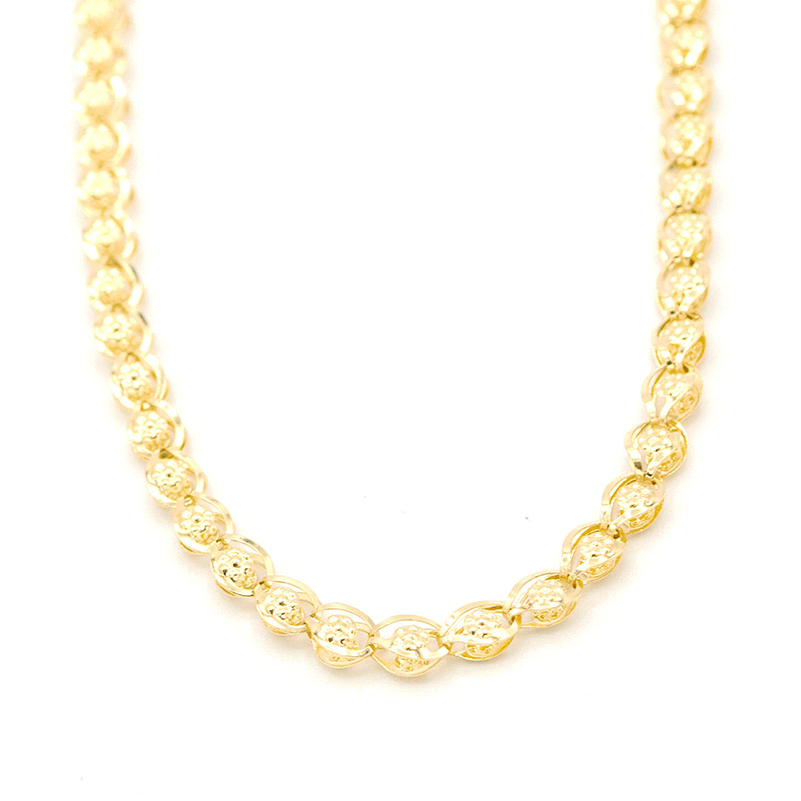 Stylový hrubý řetízek náhrdelníkového typu žluté zlato zdobený kulatými dvojočky s gravírováním po celé délce.