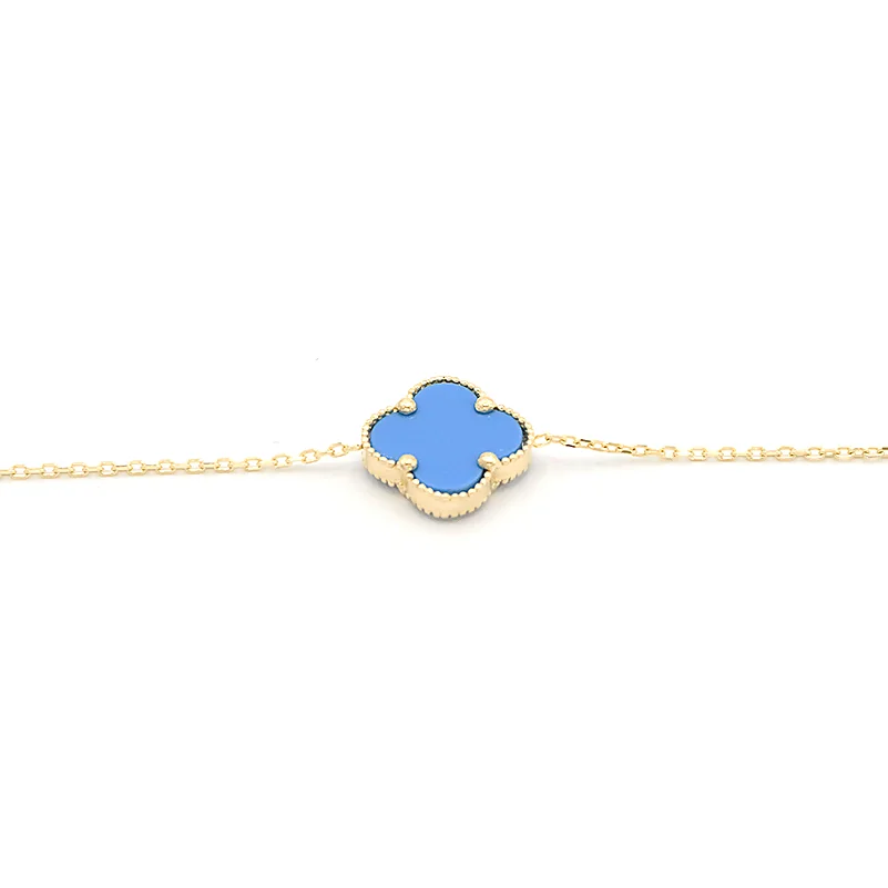 Dámský zlatý náramek s modrým čtyřlístkem ze žlutého zlata se zapínáním na pérový kroužek.