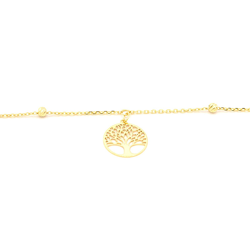 Elegantní náramek se stromem života žluté zlato zavěšeným na řetízku typu Anker obohacený dvěma malými kamínky zelené a červené barvy a kuličkami v lesklém vzhledu po obou stranách. Tento krásný jemný náramek je možné nastavit na délku 16 až 19cm.