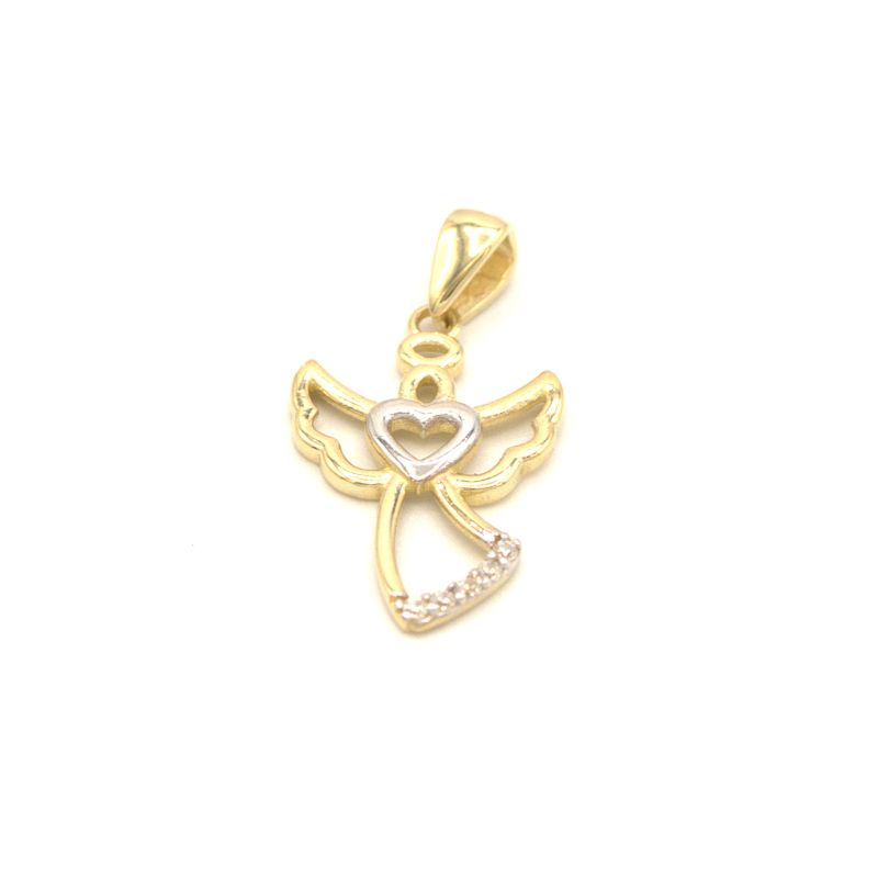 Nebeský zážitek pro Vaši kolekci - zlatý přívěsek Anděla s jemným srdíčkem a zirkony, vyrobený ze žlutého a bílého zlata. Oslnivý kousek, který rozjasá Vaši krásu. Objednejte si tento okouzlující šperk právě teď v našem e-shopu.
