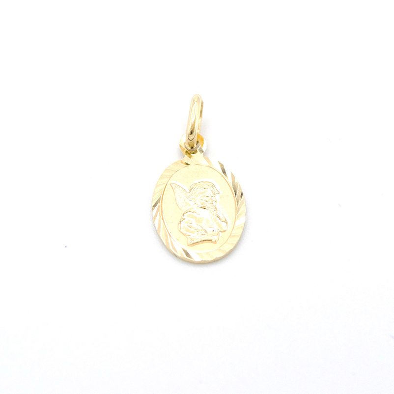 Dámský zlatý přívěsek anděl ve zdobeném oválu ze žlutého zlata.