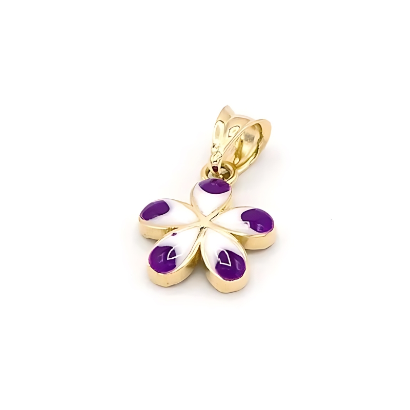 Elegantní přívěsek ze žlutého zlata je zdoben bílým podkladem a jemnými fialovými detaily na okvětních lístcích. Ideální dárek pro ženy i malé slečny, který dodá každému outfitu jemný a originální nádech.
