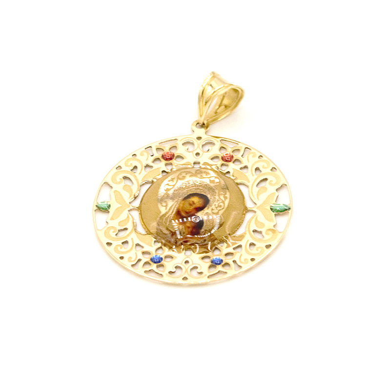Originální kulatý přívěsek ze žlutého zlata v barevné verzi s podobiznou Madonky držící dítě se zdobením po obvodu barevnými kamínky.