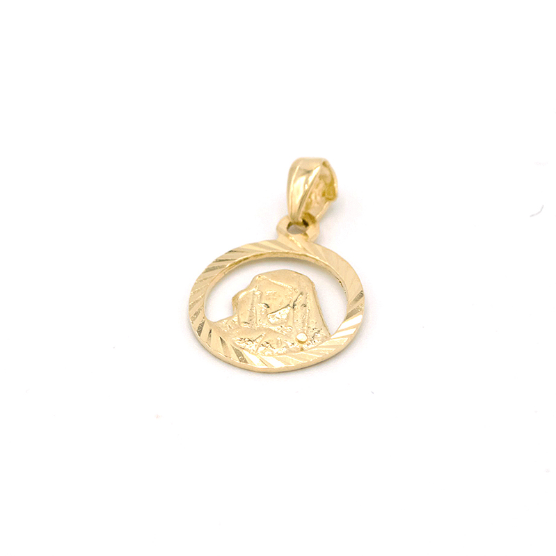 Dámský zlatý přívěsek Madonka s dítětem kulatá se zdobením ze žlutého zlata.