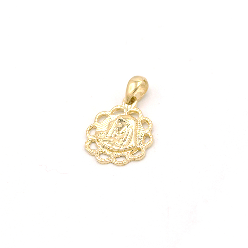 Symbolický přívěsek kulatého tvaru s vyrytou podobiznou Madonky držící dítě obohacený gravírovanými proužky na vlnkovitém obvodu přívěsku.