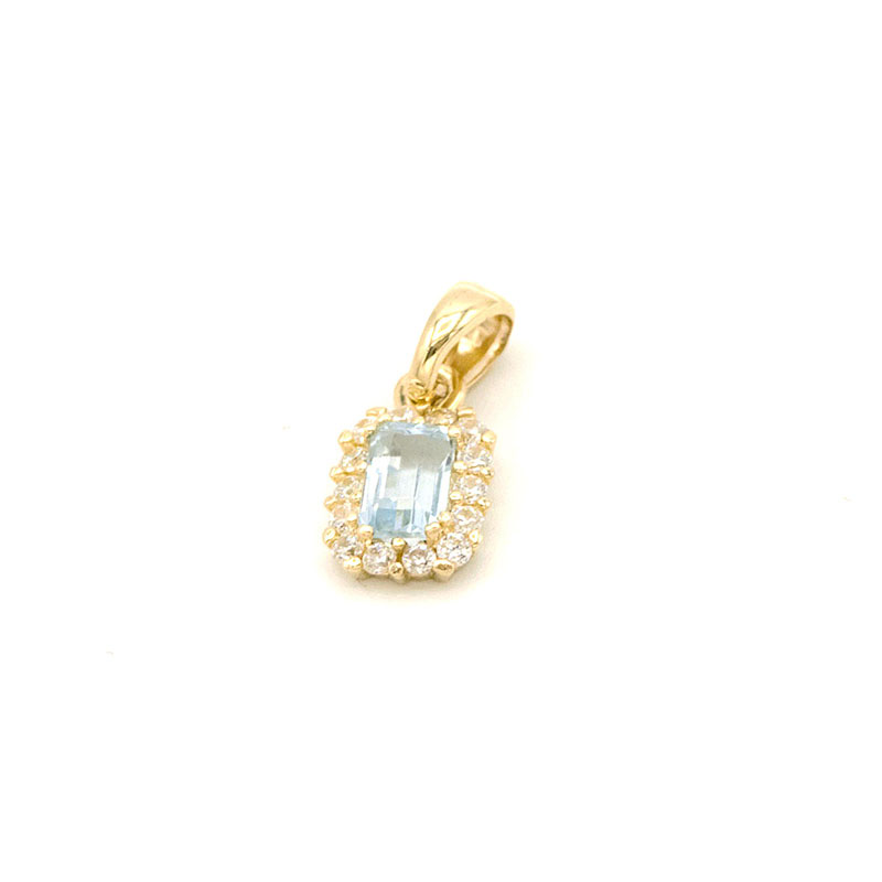 Originální přívěsek žluté zlato obdelníkového tvaru zdobený středovým kamenem topazem světle modré barvy a zirkony po obvodu kamene pestře zdobený. Součástí šperku je certifikát o pravosti kamene topaz a záruce.