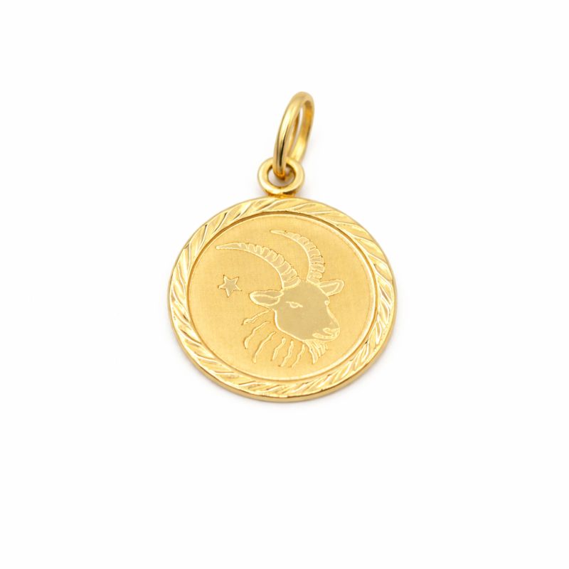 Elegantní zlatý přívěsek ve znamení Kozoroha, který zaujme svým čistým a nadčasovým designem. Kulatý medailon je zdoben jemným gravírováním znamení zvěrokruhu a doplněn dekorativním okrajem s jemným vzorem, který dodává šperku hloubku a zajímavý detail.