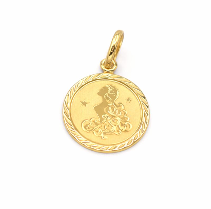 Stylový přívěsek ve znamení zvěrokruhu panny kulatého tvaru s gravírovanými proužky po obvodu v lesklém vzhledu.