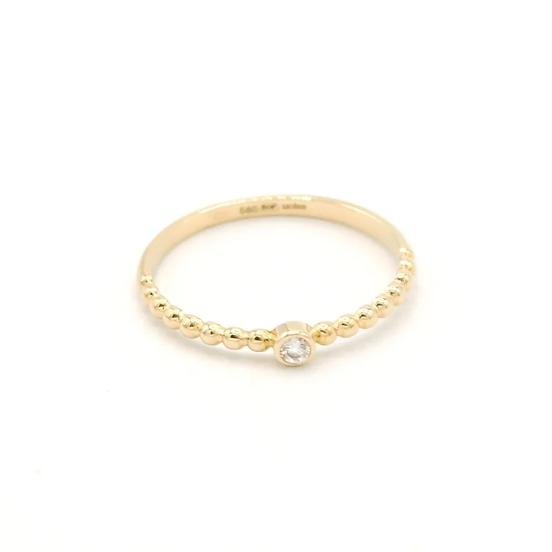 Zlatý minimalistický prsten jemný kroužek s kuličkami a zirkonem ze žlutého zlata.Originální prsten tvořený z kuliček z jedné poloviny obvodu prstenu a vsazeným středovým zirkonem vhodný pro ženy i malé slečny. Rozměry: výška ozdoby prstenu 2mm.585/1000 Au 14karátů.Šperk označený platnou puncovní zn... celý popis
