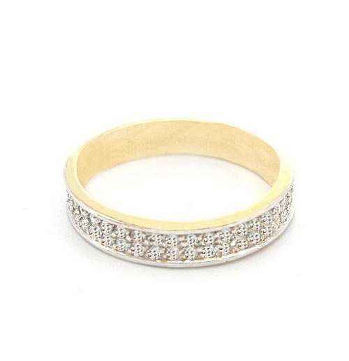 Elegantní prsten dvě barvy zlata zdobený dvěma řadami zirkonů těsně umístěných nad sebou.