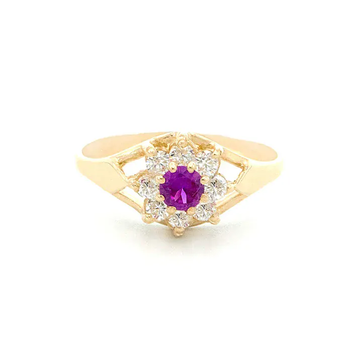 Dámský zlatý prsten kytka s růžovým kamínkem a se zirkony ze žlutého zlata vhodný jako zásnubní prsten.