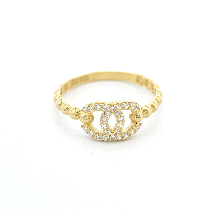 Dámský zlatý prsten dva spojené kroužky se zirkony a kuličky ze žlutého zlata.