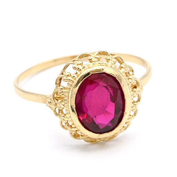 Dámský zlatý prsten s červeným kamenem zdobený ovál ze žlutého zlata.