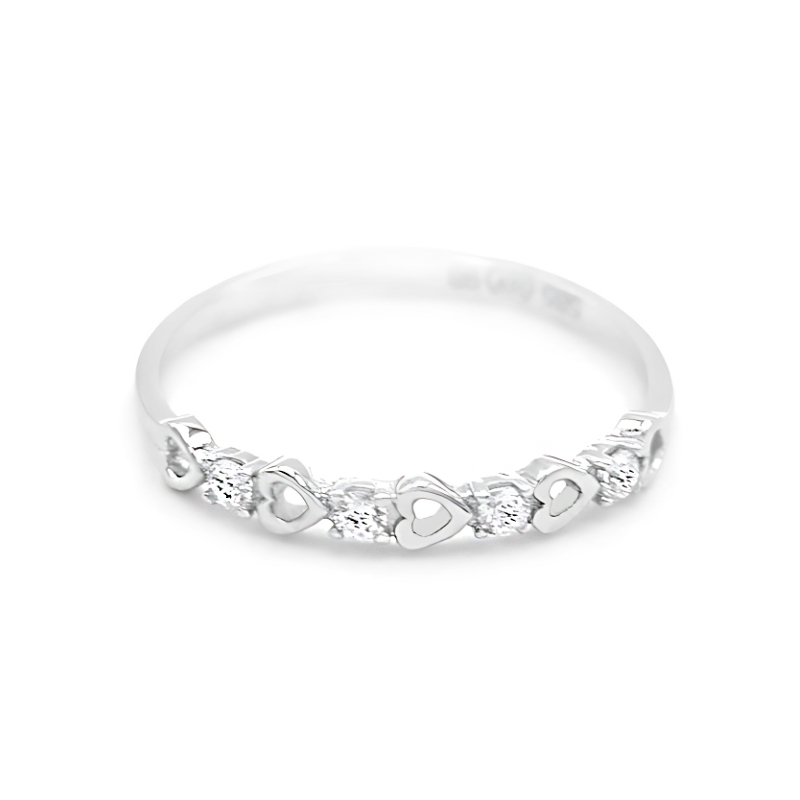 Elegantní dámský prsten vyrobený z bílého zlata zdobí jemná ležící srdíčka a třpytivé zirkony, které se pravidelně střídají v přední části šperku. Díky svému něžnému designu je ideální pro ženy i mladé slečny. Skvěle doplní každodenní outfit i slavnostní příležitosti.