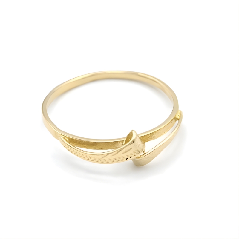 Elegantní prsten žluté zlata ve tvaru dvou zlatých na sebe navazujících plíšků opatřených uměleckým rytím. Krása a jemnost se zde snoubí s elegancí a jedinečností.