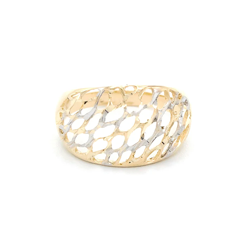 Dámský zlatý prsten s mřížkami ze žlutého a bílého zlata.