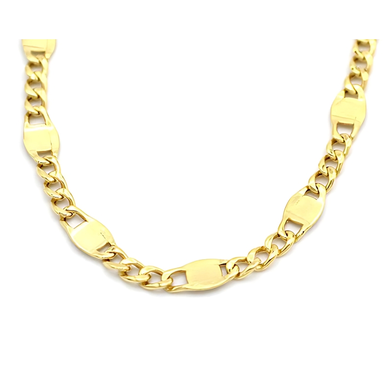 Objevte krásu tohoto stylového zlatého řetízku typu Figaro, který je zdoben plnými ploškami typu Valentina. Vyrobený ze 14karátového žlutého zlata, tento řetízek nabízí elegantní a moderní vzhled, ideální pro ženy i muže.