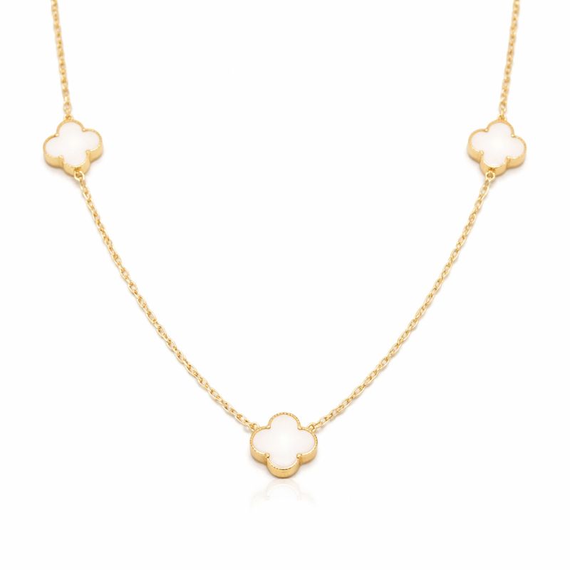 Elegantní náhrdelník se třemi přívěsky tvaru čtyřlístků zdobenými vsazeným kamenem bílé barvy upevněný ve střední části řetízku typu Anker.