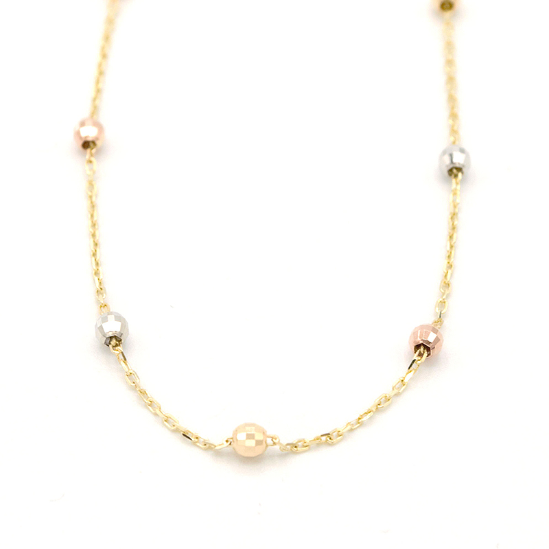 Dámský zlatý řetízek Anker zdobený lesklými kuličkami náhrdelníkového typu ze žlutého, bílého a červeného zlata se zapínáním na pérový kroužek.